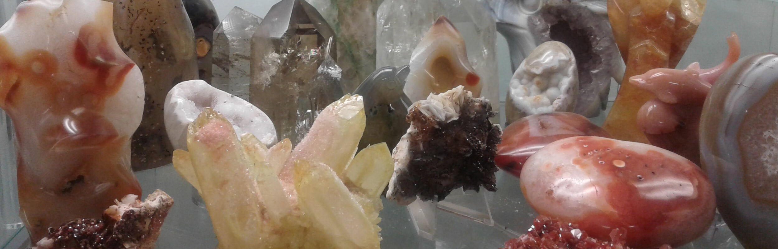A lush look into another one of our display cases, with gorgeous examples of Flourite, Prehnite (the "dreaming stone"), Quartz, Malachite and other crystals, stones & artisan jewelry. Visit us...
